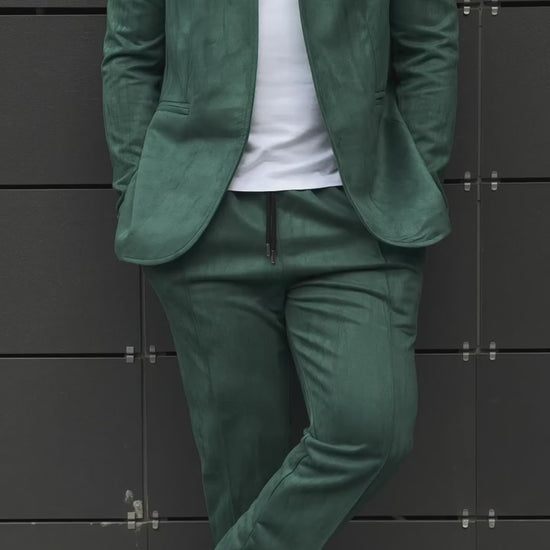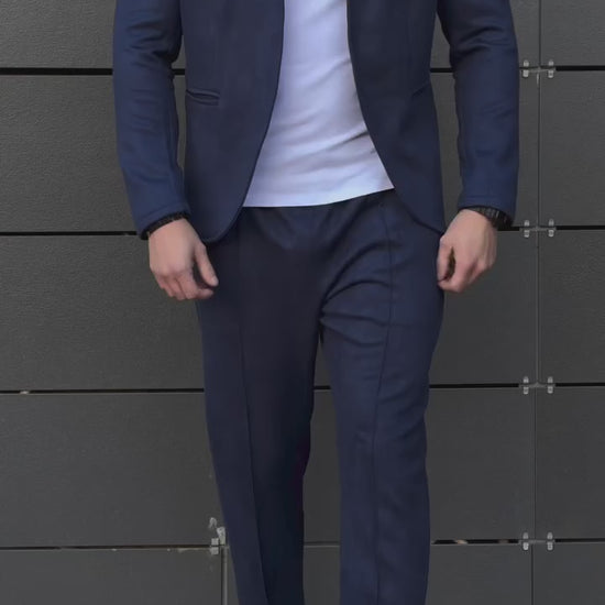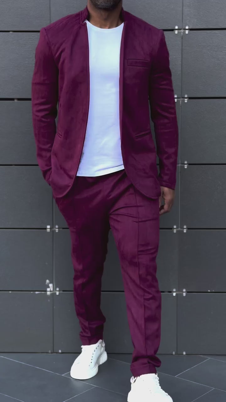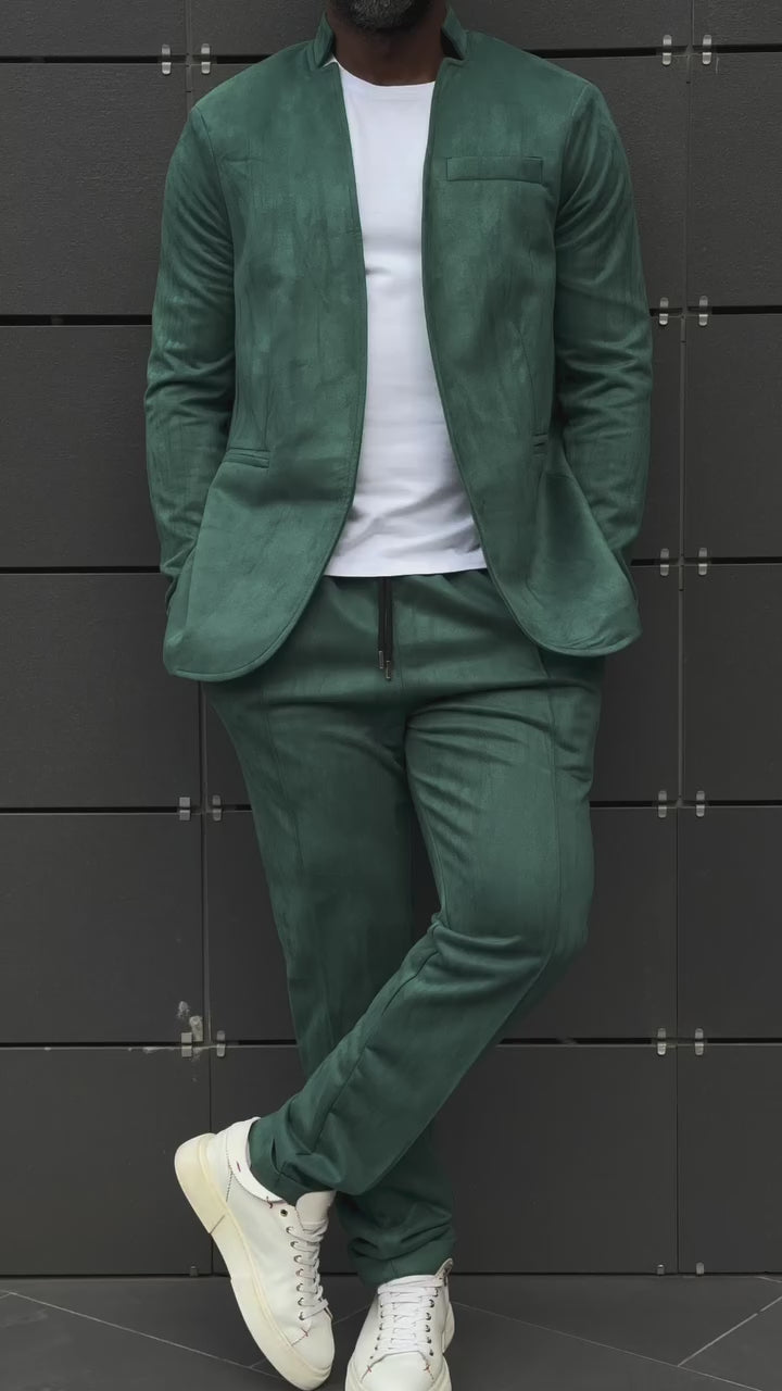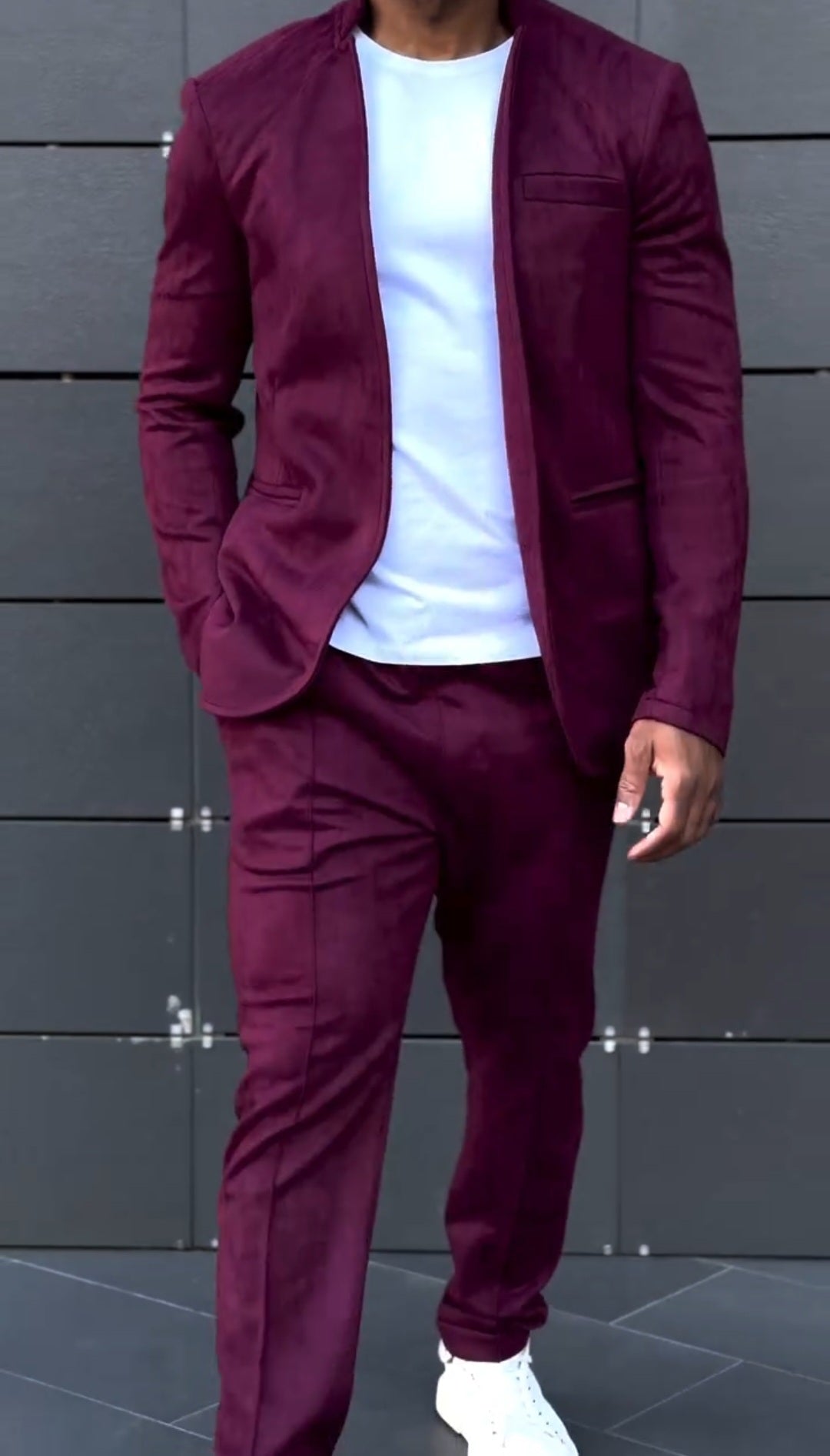 Acest compleu pentru bărbați impresionează printr-un design modern și o eleganță rafinată, fiind alegerea perfectă pentru cei care vor să se remarce prin stil și atitudine. Realizat dintr-un material fin, cu aspect de piele întoarsă (suede), setul este compus dintr-un sacou cu croială slim, fără rever, și pantaloni asortați, oferind un look contemporan și curat.