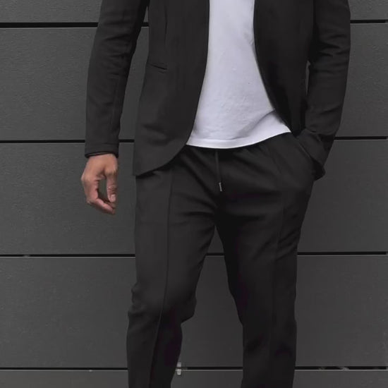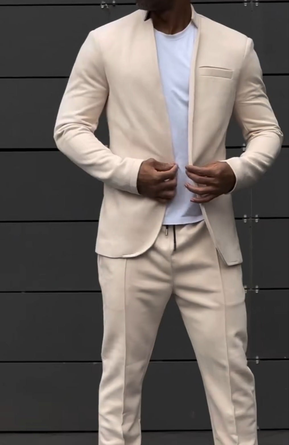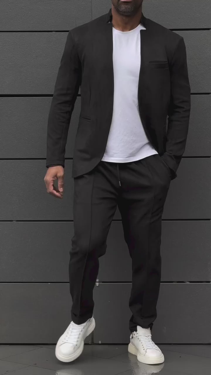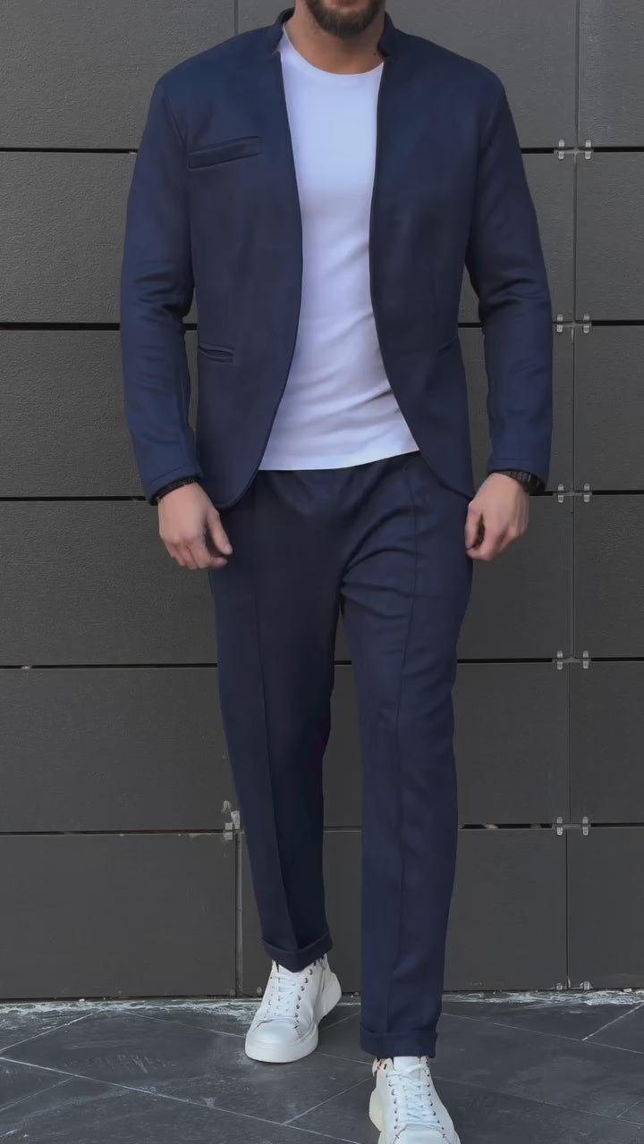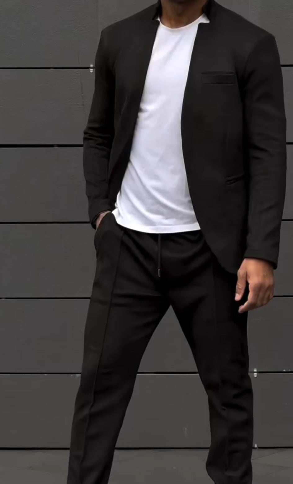 Acest compleu îmbină perfect eleganța unui costum cu lejeritatea unei ținute casual, fiind o alegere excelentă pentru bărbatul modern care apreciază simplitatea sofisticată.